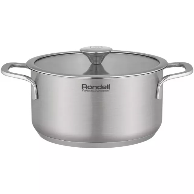 | Особенности | Технология: тройное вштампованное, а затем вплавленное дно без воздушных полостей. Аксессуары: стальная ручка. Преимущества: Плоская крышка из термостойкого стекла с паровыпуском и широким металлическим ободом; Оригинальное сочетание матовой полировки корпуса и глянцевой полировки аксессуаров. |
