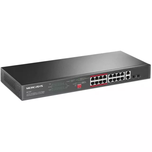 | Особенности | 16 портов RJ45 PoE+ 10 / 100 Мбит / c, 2 гигабитных порта RJ45 и 2 комбинированных гигабитных SFP слота |