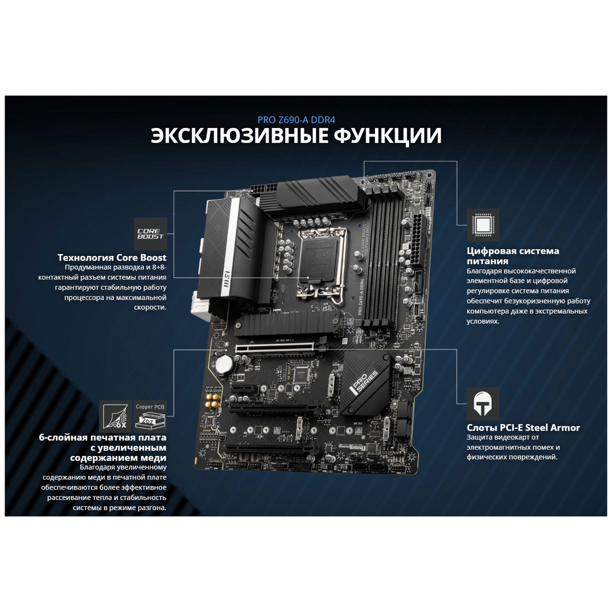 Комментарий: Был сложный выбор между этой платой и GIGABYTE Z690 GAMING X DDR4, т.к. стоили примерно одинаково. Но для меня лично у этой платы больше преимуществ. У меня клавиатура с интерфейсом PS/2 и гарнитура с реальным звуком 5.1, у которой подключение осуществляется с помощью USB и четырёх джеков, поэтому мне было важно наличие разъёма PS/2 и большого кол-ва аудио разъёмов. Разъёмы для подключения вентиляторов расположены удобно, есть над верхним слотом M.2, что редко встречается на современных материнских платах других производителей.Владею этой платой уже полгода. Пока ей доволен, никаких серьёзных проблем не возникало. На данный момент установлен биос версии 1.90 (от 08.11.22, на официальном сайте 7D25v19 от 09.11.22). Время запуска биоса ~6 секунд. После установки процессора наблюдался видимый изгиб бэкплейта сокета. Это распространённая проблема 1700 сокета, поэтому я установил известную рамку Thermalright LGA 1700-BCF. Вдобавок металлический бэкплейт кулера DeepCool AK620 хорошо прижал заводской.Моя система: i5-12400F, Patriot Viper 4 Blackout DDR4 16GB 4000MHz CL19 (PVB416G400C9K), DeepCool AK620, 2x Kinston A2000 1TB. Эта память на чипах Samsung B-Die стабильно работает на частоте 3600 МГц в режиме Gear 1 с таймингами 14-14-14-28 CR1. Частоты выше достигаются только в режиме Gear 2, т.к. i5-12400 это процессор с заблокированным множителем, у которого нельзя регулировать напряжение на контроллер памяти. На несколько месяцев создавал аппаратный RAID 0 из двух одинаковых накопителей M.2. Работал без проблем, линейные скорости чтения и записи удваивались.Если вас смущает высокая (по вашему мнению) температура PCH в простое, то это можно исправить в биосе: OC